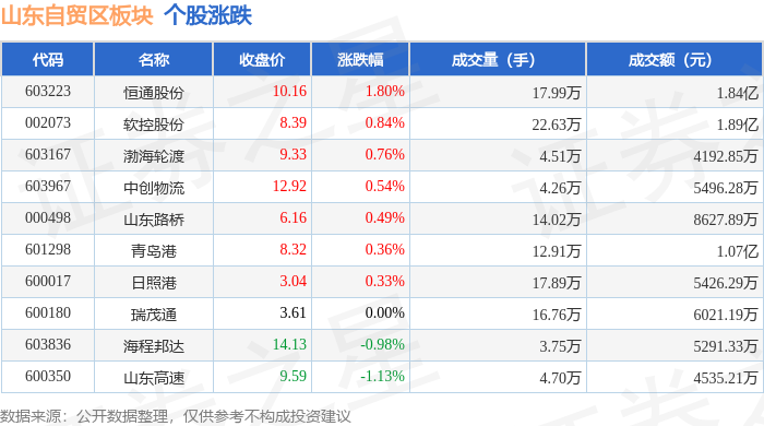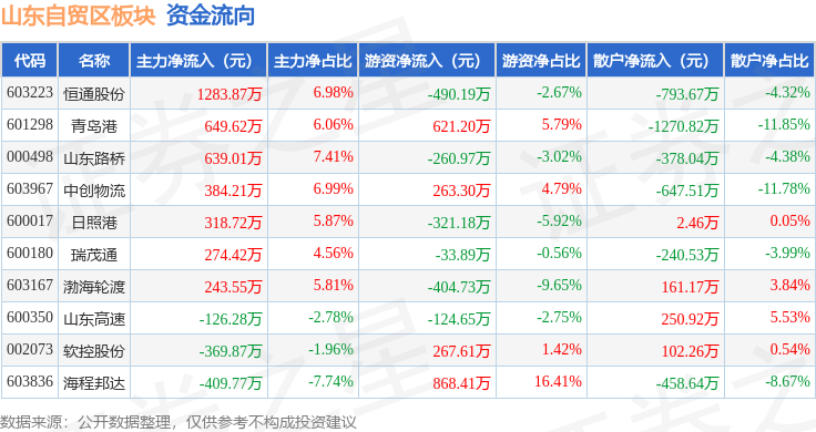 从资金流向上来看,当日山东自贸区板块主力资金净流入2887.48万元,游资资金净流入384.91万元,散户资金净流出3272.39万元。山东自贸区板块个股资金流向见下表: