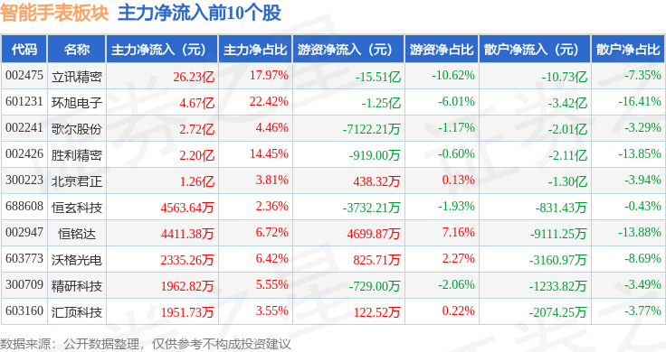 从资金流向上来看,当日智能手表板块主力资金净流入27.83亿元,游资资金净流出14.34亿元,散户资金净流出13.49亿元。智能手表板块个股资金流向见下表: