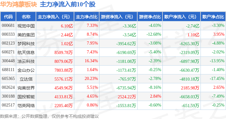 从资金流向上来看,当日华为鸿蒙板块主力资金净流出39.35亿元,游资资金净流出1.44亿元,散户资金净流入40.79亿元。华为鸿蒙板块个股资金流向见下表:
