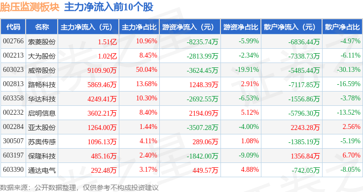 从资金流向上来看,当日胎压监测板块主力资金净流入1.77亿元,游资资金净流出1.66亿元,散户资金净流出1036.67万元。胎压监测板块个股资金流向见下表: