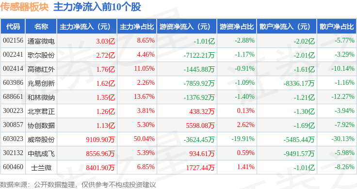 从资金流向上来看,当日传感器板块主力资金净流出25.88亿元,游资资金净流入3.1亿元,散户资金净流入22.78亿元。传感器板块个股资金流向见下表: