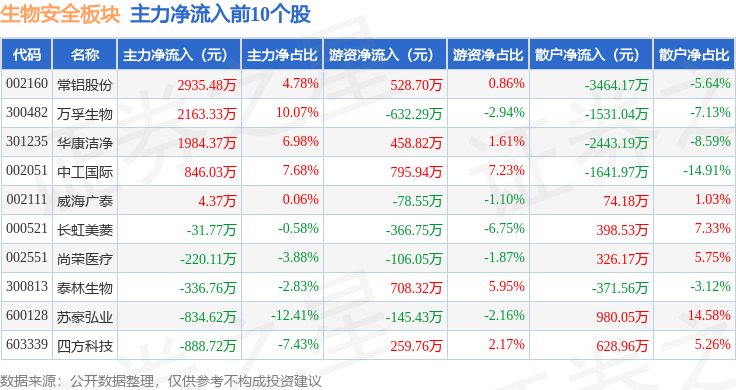 从资金流向上来看,当日生物安全板块主力资金净流出3.03亿元,游资资金净流入7240.35万元,散户资金净流入2.3亿元。生物安全板块个股资金流向见下表: