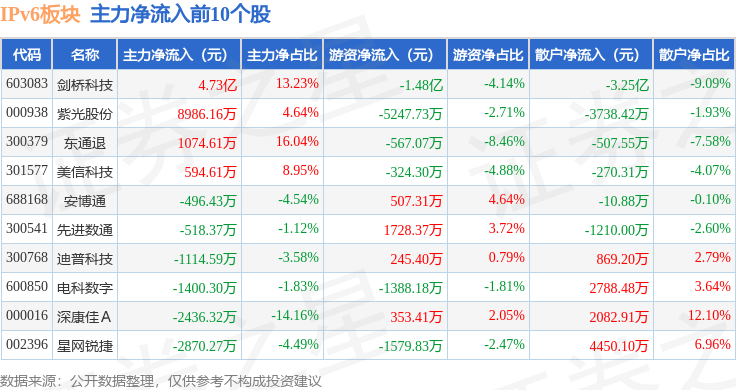从资金流向上来看,当日IPv6板块主力资金净流出15.36亿元,游资资金净流入2.16亿元,散户资金净流入13.2亿元。IPv6板块个股资金流向见下表: