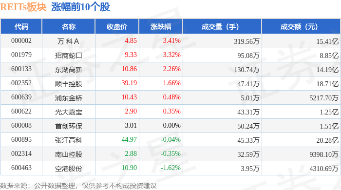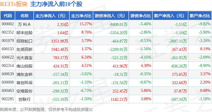 从资金流向上来看,当日REITs板块主力资金净流入2.65亿元,游资资金净流出1.23亿元,散户资金净流出1.42亿元。REITs板块个股资金流向见下表: