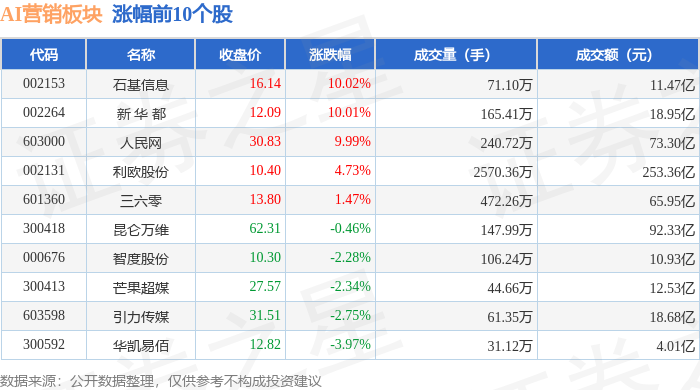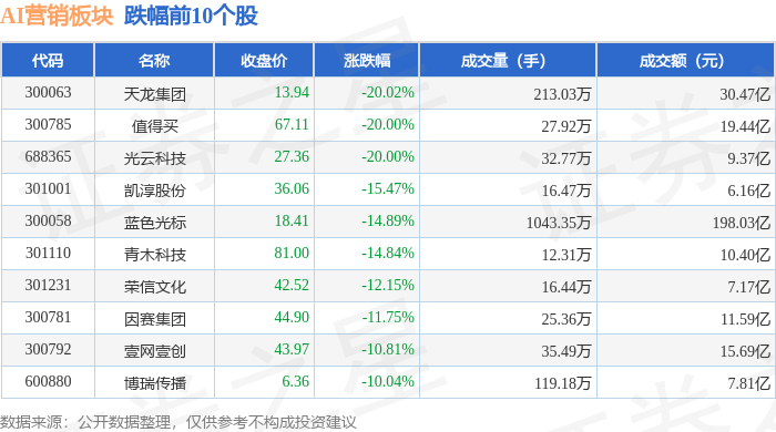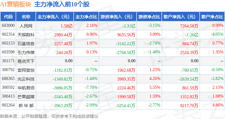 从资金流向上来看,当日AI营销板块主力资金净流出85.56亿元,游资资金净流入14.68亿元,散户资金净流入70.88亿元。AI营销板块个股资金流向见下表: