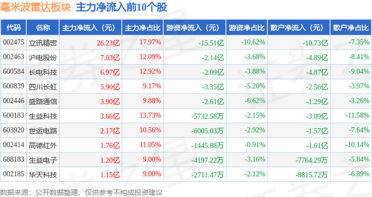 从资金流向上来看,当日毫米波雷达板块主力资金净流入20.09亿元,游资资金净流出18.35亿元,散户资金净流出1.74亿元。毫米波雷达板块个股资金流向见下表: