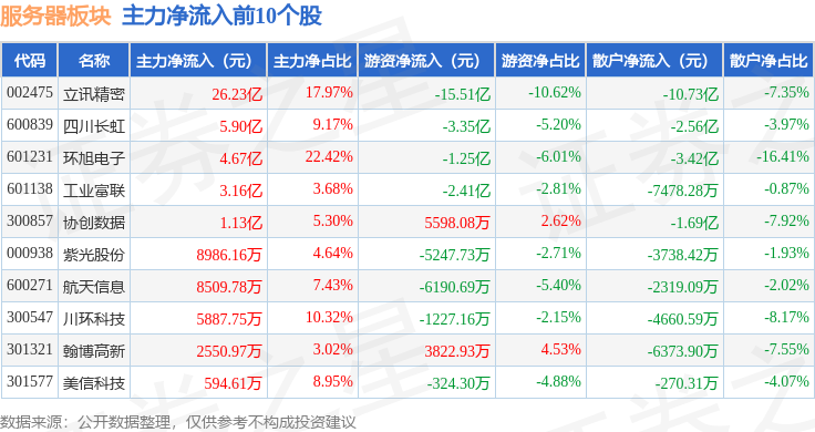 从资金流向上来看,当日服务器板块主力资金净流入14.74亿元,游资资金净流出14.4亿元,散户资金净流出3395.78万元。服务器板块个股资金流向见下表:
