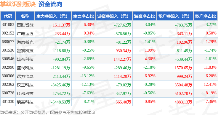 从资金流向上来看,当日掌纹识别板块主力资金净流出1.63亿元,游资资金净流入1950.35万元,散户资金净流入1.44亿元。掌纹识别板块个股资金流向见下表: