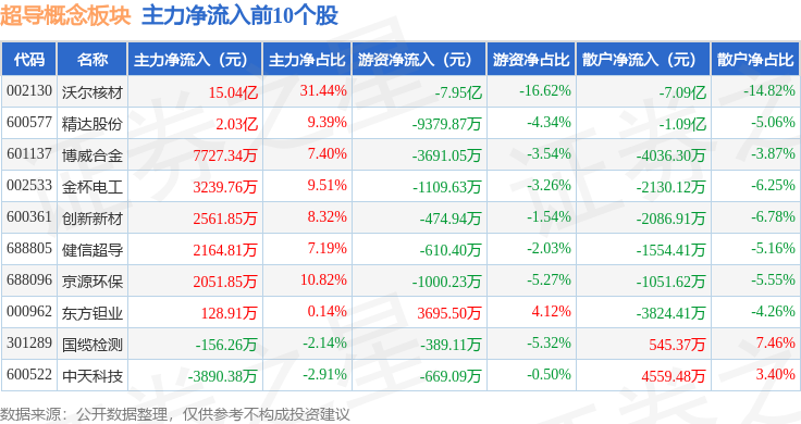 从资金流向上来看,当日超导概念板块主力资金净流入2.15亿元,游资资金净流出9.1亿元,散户资金净流入6.95亿元。超导概念板块个股资金流向见下表: