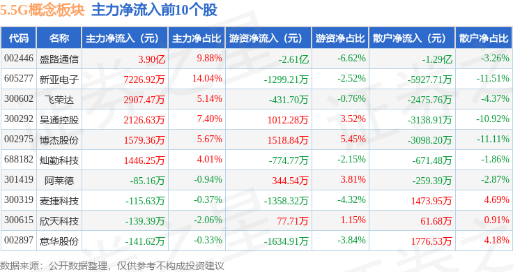 从资金流向上来看,当日5.5G概念板块主力资金净流出20.33亿元,游资资金净流入1.47亿元,散户资金净流入18.86亿元。5.5G概念板块个股资金流向见下表: