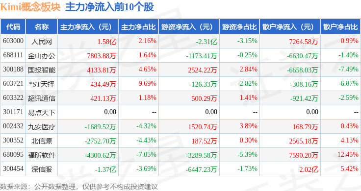 从资金流向上来看,当日Kimi概念板块主力资金净流出25.4亿元,游资资金净流入6.04亿元,散户资金净流入19.35亿元。Kimi概念板块个股资金流向见下表: