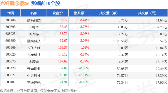 从资金流向上来看,当日光纤概念板块主力资金净流出10.46亿元,游资资金净流入3.15亿元,散户资金净流入7.31亿元。光纤概念板块个股资金流向见下表: