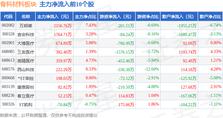 从资金流向上来看,当日骨科材料板块主力资金净流出2631.5万元,游资资金净流出6031.72万元,散户资金净流入8663.22万元。骨科材料板块个股资金流向见下表: