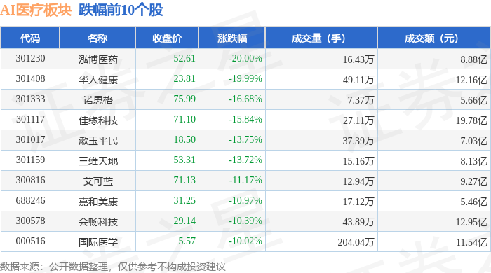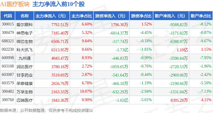 从资金流向上来看,当日AI医疗板块主力资金净流出89.08亿元,游资资金净流入6.13亿元,散户资金净流入82.95亿元。AI医疗板块个股资金流向见下表: