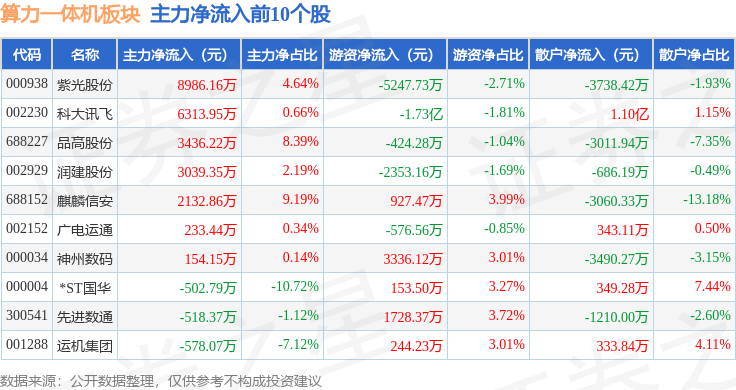 从资金流向上来看,当日算力一体机板块主力资金净流出34.39亿元,游资资金净流入10.83亿元,散户资金净流入23.56亿元。算力一体机板块个股资金流向见下表: