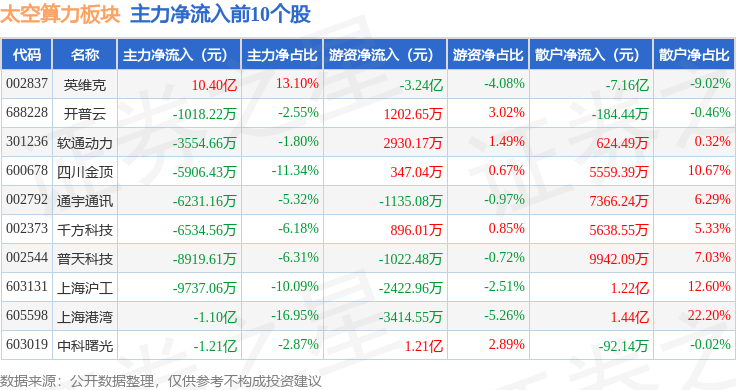 从资金流向上来看,当日太空算力板块主力资金净流出55.37亿元,游资资金净流入14.3亿元,散户资金净流入41.07亿元。太空算力板块个股资金流向见下表: