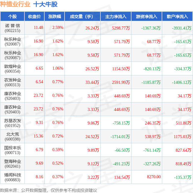 个股表现方面,种植业行业当日领涨股为诺 普 信(002215),该股当日报收11.48,上涨2.59%,成交量26.24万,主力资金净流入5298.77万元。秋乐种业(920087)以上涨1.62%紧随其后,该股当日成交量9.58万,主力资金净流入571.79万元。除此之外,秋乐种业(920087)、敦煌种业(600354)、农发种业(600313)均进入当日牛股之列。具体个股列表见下表: