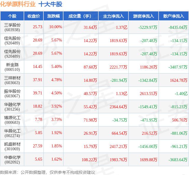 个股表现方面,化学原料行业当日领涨股为三孚股份(603938),该股当日报收25.73,上涨10.0%,成交量31.64万,主力资金净流入1.37亿元。佳先股份(920489)以上涨5.67%紧随其后,该股当日成交量14.22万,主力资金净流入1819.63万元。除此之外,佳先股份(920489)、新金路(000510)、三祥新材(603663)均进入当日牛股之列。具体个股列表见下表: