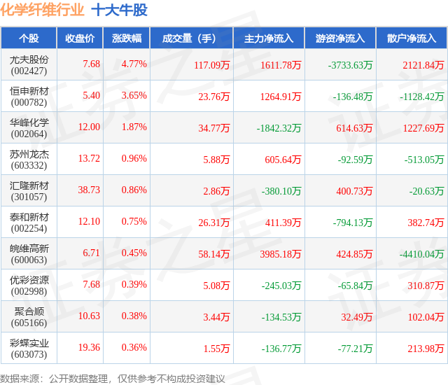 个股表现方面,化学纤维行业当日领涨股为尤夫股份(002427),该股当日报收7.68,上涨4.77%,成交量117.09万,主力资金净流入1611.78万元。恒申新材(000782)以上涨3.65%紧随其后,该股当日成交量23.76万,主力资金净流入1264.91万元。除此之外,华峰化学(002064)、苏州龙杰(603332)、汇隆新材(301057)均进入当日牛股之列。具体个股列表见下表: