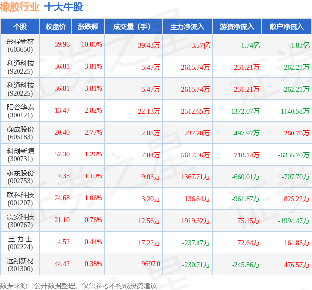 个股表现方面,橡胶行业当日领涨股为彤程新材(603650),该股当日报收59.96,上涨10.0%,成交量39.43万,主力资金净流入3.57亿元。利通科技(920225)以上涨3.81%紧随其后,该股当日成交量5.47万,主力资金净流入2615.74万元。除此之外,利通科技(920225)、阳谷华泰(300121)、确成股份(605183)均进入当日牛股之列。具体个股列表见下表: