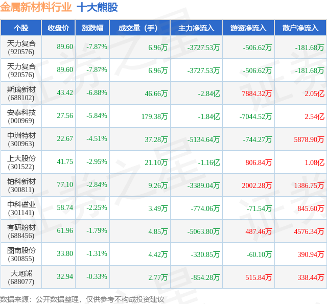 个股表现方面,金属新材料行业当日领跌股为天力复合(920576),该股当日报收89.6,下跌7.87%,成交量6.96万,主力资金净流出3727.53万元。天力复合(920576)以下跌7.87%紧随其后,该股当日成交量6.96万,主力资金净流出3727.53万元。除此之外,斯瑞新材(688102)、安泰科技(000969)、中洲特材(300963)均进入当日熊股之列。具体个股列表见下表: