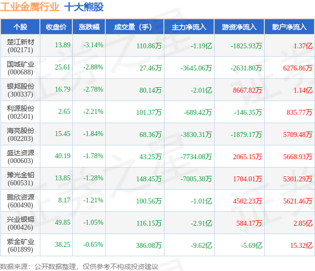 个股表现方面,工业金属行业当日领跌股为楚江新材(002171),该股当日报收13.89,下跌3.14%,成交量110.86万,主力资金净流出1.19亿元。国城矿业(000688)以下跌2.88%紧随其后,该股当日成交量27.46万,主力资金净流出3645.06万元。除此之外,银邦股份(300337)、利源股份(002501)、海亮股份(002203)均进入当日熊股之列。具体个股列表见下表: