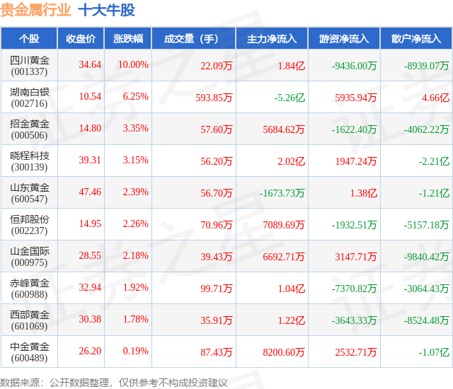 个股表现方面,贵金属行业当日领涨股为四川黄金(001337),该股当日报收34.64,上涨10.0%,成交量22.09万,主力资金净流入1.84亿元。湖南白银(002716)以上涨6.25%紧随其后,该股当日成交量593.85万,主力资金净流出5.26亿元。除此之外,招金黄金(000506)、晓程科技(300139)、山东黄金(600547)均进入当日牛股之列。具体个股列表见下表: