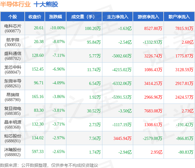 个股表现方面,半导体行业当日领跌股为电科芯片(600877),该股当日报收20.61,下跌10.0%,成交量100.2万,主力资金净流出1.63亿元。航宇微(300053)以下跌8.07%紧随其后,该股当日成交量95.84万,主力资金净流出2.54亿元。除此之外,盛科通信(688702)、龙芯中科(688047)、东微半导(688261)均进入当日熊股之列。具体个股列表见下表: