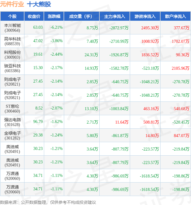 个股表现方面,元件行业当日领跌股为本川智能(300964),该股当日报收63.03,下跌6.21%,成交量8.75万,主力资金净流出2872.97万元。高华科技(688539)以下跌3.86%紧随其后,该股当日成交量7.4万,主力资金净流出2710.99万元。除此之外,科翔股份(300903)、骏亚科技(603386)、则成电子(920821)均进入当日熊股之列。具体个股列表见下表: