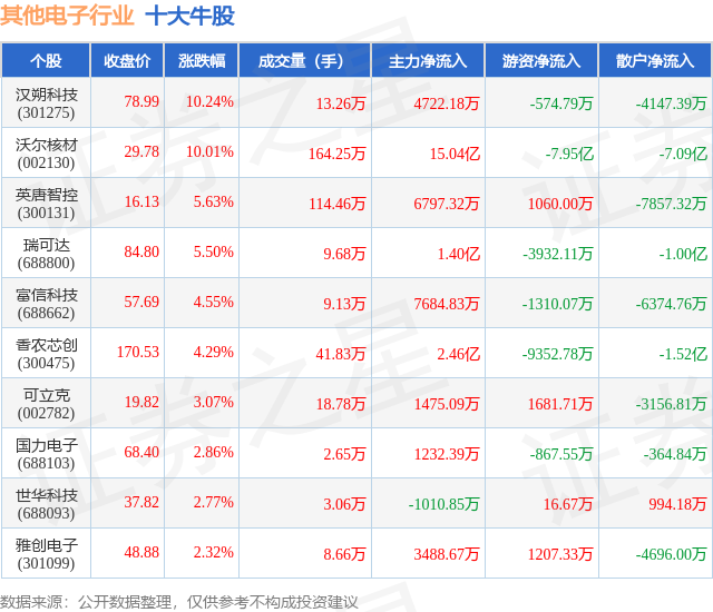 个股表现方面,其他电子行业当日领涨股为汉朔科技(301275),该股当日报收78.99,上涨10.24%,成交量13.26万,主力资金净流入4722.18万元。沃尔核材(002130)以上涨10.01%紧随其后,该股当日成交量164.25万,主力资金净流入15.04亿元。除此之外,英唐智控(300131)、瑞可达(688800)、富信科技(688662)均进入当日牛股之列。具体个股列表见下表: