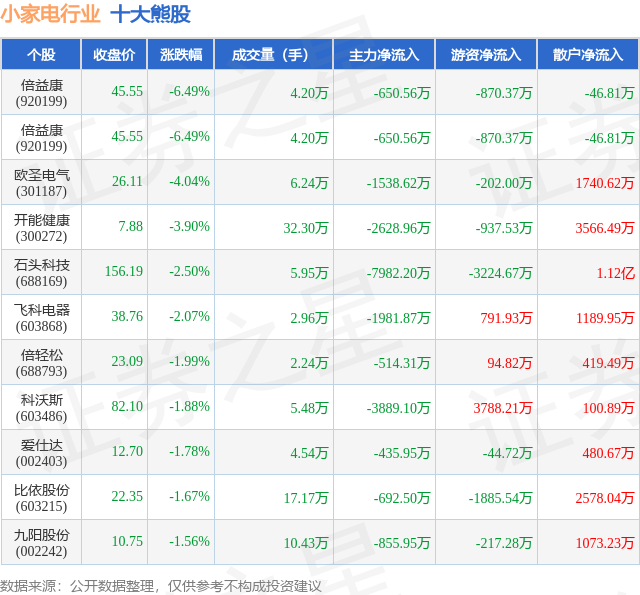 个股表现方面,小家电行业当日领跌股为倍益康(920199),该股当日报收45.55,下跌6.49%,成交量4.2万,主力资金净流出650.56万元。倍益康(920199)以下跌6.49%紧随其后,该股当日成交量4.2万,主力资金净流出650.56万元。除此之外,欧圣电气(301187)、开能健康(300272)、石头科技(688169)均进入当日熊股之列。具体个股列表见下表: