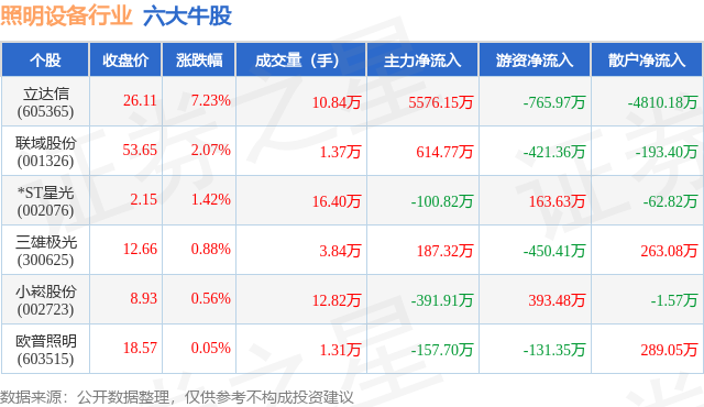 个股表现方面,照明设备行业当日领涨股为立达信(605365),该股当日报收26.11,上涨7.23%,成交量10.84万,主力资金净流入5576.15万元。联域股份(001326)以上涨2.07%紧随其后,该股当日成交量1.37万,主力资金净流入614.77万元。除此之外,*ST星光(002076)、三雄极光(300625)、小崧股份(002723)均进入当日牛股之列。具体个股列表见下表: