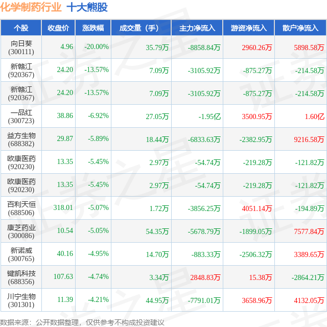 个股表现方面,化学制药行业当日领跌股为向日葵(300111),该股当日报收4.96,下跌20.0%,成交量35.79万,主力资金净流出8858.84万元。新赣江(920367)以下跌13.57%紧随其后,该股当日成交量7.09万,主力资金净流出3105.92万元。除此之外,新赣江(920367)、一品红(300723)、益方生物(688382)均进入当日熊股之列。具体个股列表见下表: