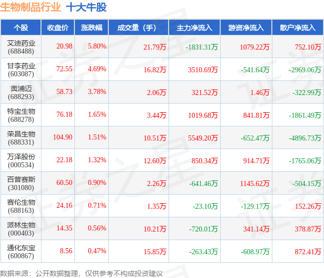 个股表现方面,生物制品行业当日领涨股为艾迪药业(688488),该股当日报收20.98,上涨5.8%,成交量21.79万,主力资金净流出1831.31万元。甘李药业(603087)以上涨4.69%紧随其后,该股当日成交量16.82万,主力资金净流入3510.69万元。除此之外,奥浦迈(688293)、特宝生物(688278)、荣昌生物(688331)均进入当日牛股之列。具体个股列表见下表: