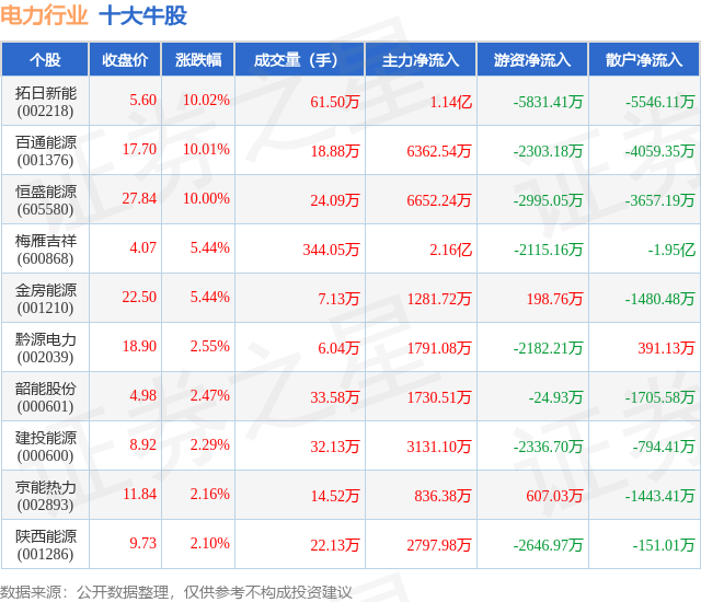 个股表现方面,电力行业当日领涨股为拓日新能(002218),该股当日报收5.6,上涨10.02%,成交量61.5万,主力资金净流入1.14亿元。百通能源(001376)以上涨10.01%紧随其后,该股当日成交量18.88万,主力资金净流入6362.54万元。除此之外,恒盛能源(605580)、梅雁吉祥(600868)、金房能源(001210)均进入当日牛股之列。具体个股列表见下表: