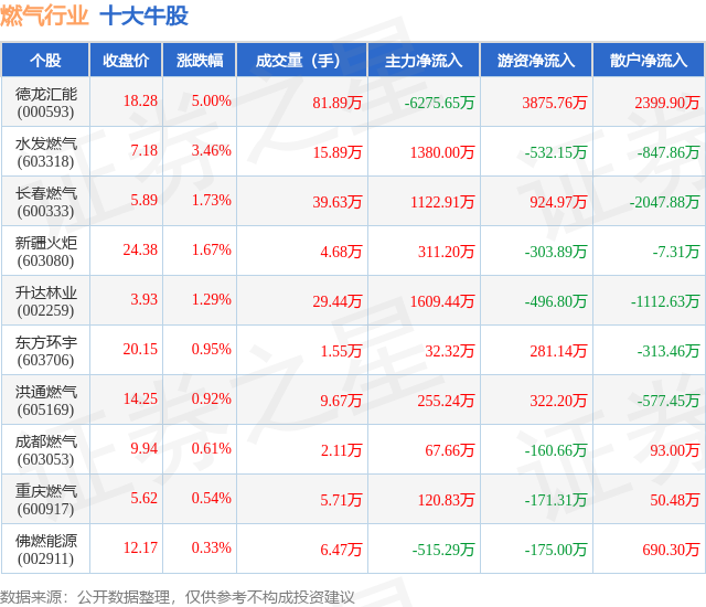 个股表现方面,燃气行业当日领涨股为德龙汇能(000593),该股当日报收18.28,上涨5.0%,成交量81.89万,主力资金净流出6275.65万元。水发燃气(603318)以上涨3.46%紧随其后,该股当日成交量15.89万,主力资金净流入1380.0万元。除此之外,长春燃气(600333)、新疆火炬(603080)、升达林业(002259)均进入当日牛股之列。具体个股列表见下表: