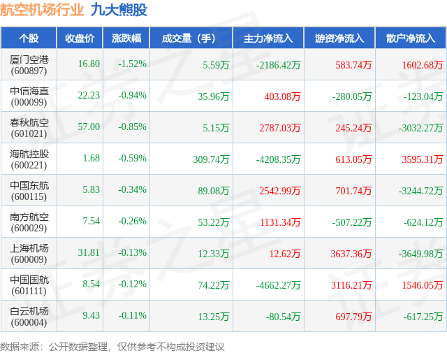 个股表现方面,航空机场行业当日领跌股为厦门空港(600897),该股当日报收16.8,下跌1.52%,成交量5.59万,主力资金净流出2186.42万元。中信海直(000099)以下跌0.94%紧随其后,该股当日成交量35.96万,主力资金净流入403.08万元。除此之外,春秋航空(601021)、海航控股(600221)、中国东航(600115)均进入当日熊股之列。具体个股列表见下表: