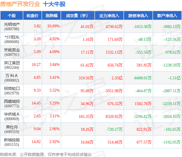 个股表现方面,房地产开发行业当日领涨股为光明地产(600708),该股当日报收3.82,上涨10.09%,成交量41.01万,主力资金净流入4736.62万元。*ST阳光(000608)以上涨4.92%紧随其后,该股当日成交量1.16万,主力资金净流入171.69万元。除此之外,京能置业(600791)、滨江集团(002244)、万 科A(000002)均进入当日牛股之列。具体个股列表见下表: