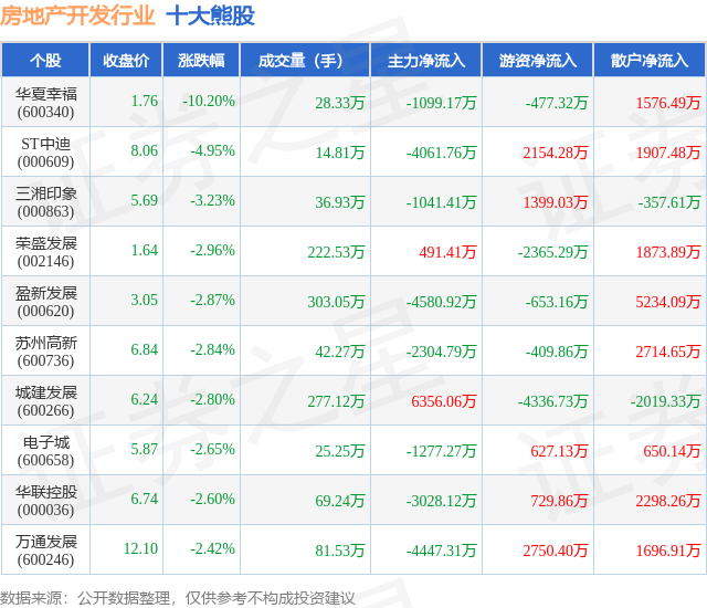 个股表现方面,房地产开发行业当日领跌股为华夏幸福(600340),该股当日报收1.76,下跌10.2%,成交量28.33万,主力资金净流出1099.17万元。ST中迪(000609)以下跌4.95%紧随其后,该股当日成交量14.81万,主力资金净流出4061.76万元。除此之外,三湘印象(000863)、荣盛发展(002146)、盈新发展(000620)均进入当日熊股之列。具体个股列表见下表: