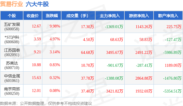 个股表现方面,贸易行业当日领涨股为五矿发展(600058),该股当日报收12.67,上涨9.98%,成交量17.3万,主力资金净流出1369.01万元。*ST沪科(600608)以上涨4.97%紧随其后,该股当日成交量4.5万,主力资金净流入68.63万元。除此之外,江苏国泰(002091)、苏美达(600710)、中信金属(601061)均进入当日牛股之列。具体个股列表见下表: