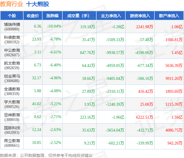 个股表现方面,教育行业当日领跌股为博瑞传播(600880),该股当日报收6.36,下跌10.04%,成交量119.18万,主力资金净流出1.28亿元。科德教育(300192)以下跌6.78%紧随其后,该股当日成交量35.47万,主力资金净流出1509.33万元。除此之外,中公教育(002607)、凯文教育(002659)、创业黑马(300688)均进入当日熊股之列。具体个股列表见下表: