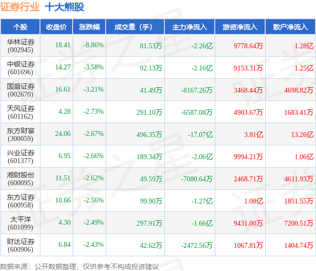 个股表现方面,证券行业当日领跌股为华林证券(002945),该股当日报收18.41,下跌8.86%,成交量81.53万,主力资金净流出2.26亿元。中银证券(601696)以下跌3.58%紧随其后,该股当日成交量92.13万,主力资金净流出2.16亿元。除此之外,国盛证券(002670)、天风证券(601162)、东方财富(300059)均进入当日熊股之列。具体个股列表见下表: