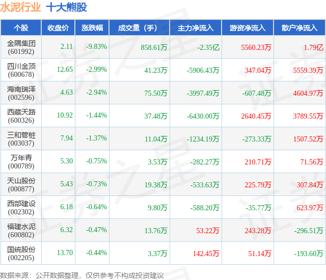 个股表现方面,水泥行业当日领跌股为金隅集团(601992),该股当日报收2.11,下跌9.83%,成交量858.61万,主力资金净流出2.35亿元。四川金顶(600678)以下跌2.99%紧随其后,该股当日成交量41.23万,主力资金净流出5906.43万元。除此之外,海南瑞泽(002596)、西藏天路(600326)、三和管桩(003037)均进入当日熊股之列。具体个股列表见下表: