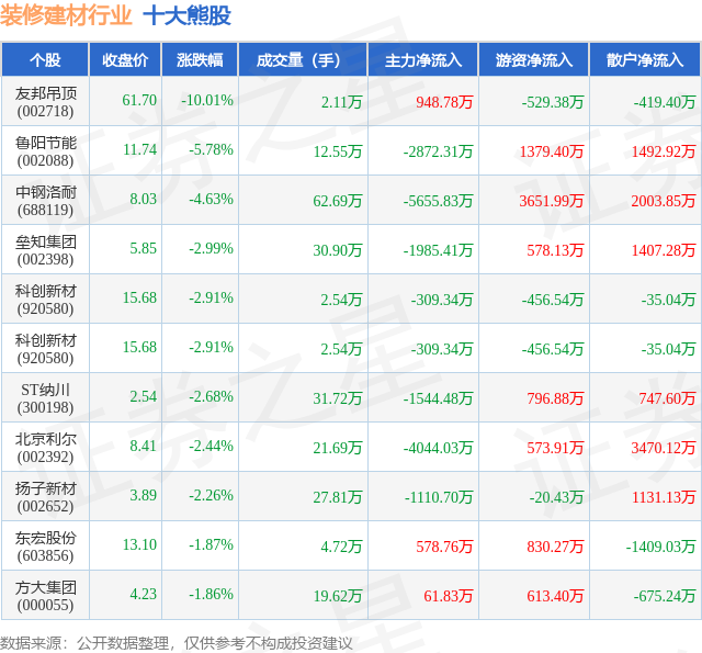 个股表现方面,装修建材行业当日领跌股为友邦吊顶(002718),该股当日报收61.7,下跌10.01%,成交量2.11万,主力资金净流入948.78万元。鲁阳节能(002088)以下跌5.78%紧随其后,该股当日成交量12.55万,主力资金净流出2872.31万元。除此之外,中钢洛耐(688119)、垒知集团(002398)、科创新材(920580)均进入当日熊股之列。具体个股列表见下表: