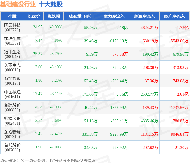 个股表现方面,基础建设行业当日领跌股为国晟科技(603778),该股当日报收24.95,下跌9.99%,成交量55.46万,主力资金净流出2.18亿元。东珠生态(603359)以下跌4.86%紧随其后,该股当日成交量39.46万,主力资金净流出6173.19万元。除此之外,冠中生态(300948)、美丽生态(000010)、节能铁汉(300197)均进入当日熊股之列。具体个股列表见下表: