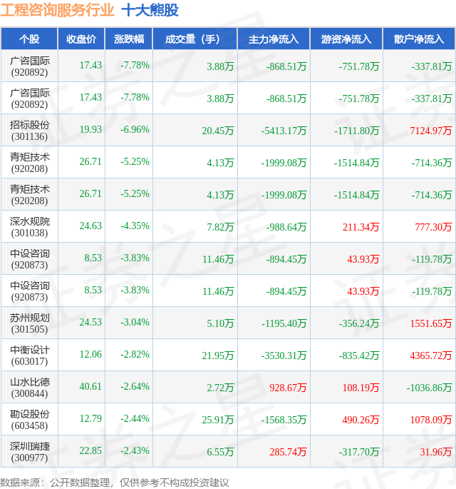 个股表现方面,工程咨询服务行业当日领跌股为广咨国际(920892),该股当日报收17.43,下跌7.78%,成交量3.88万,主力资金净流出868.51万元。广咨国际(920892)以下跌7.78%紧随其后,该股当日成交量3.88万,主力资金净流出868.51万元。除此之外,招标股份(301136)、青矩技术(920208)、青矩技术(920208)均进入当日熊股之列。具体个股列表见下表: