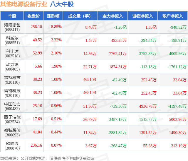 个股表现方面,其他电源设备行业当日领涨股为海博思创(688411),该股当日报收256.1,上涨8.85%,成交量8.4万,主力资金净流出1.26亿元。科威尔(688551)以上涨2.32%紧随其后,该股当日成交量1.47万,主力资金净流入493.25万元。除此之外,科士达(002518)、动力源(600405)、雷特科技(920110)均进入当日牛股之列。具体个股列表见下表: