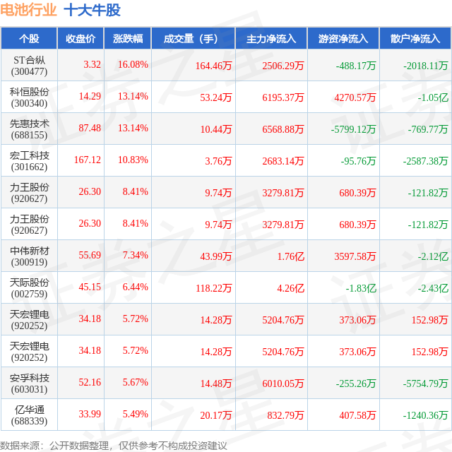 个股表现方面,电池行业当日领涨股为ST合纵(300477),该股当日报收3.32,上涨16.08%,成交量164.46万,主力资金净流入2506.29万元。科恒股份(300340)以上涨13.14%紧随其后,该股当日成交量53.24万,主力资金净流入6195.37万元。除此之外,先惠技术(688155)、宏工科技(301662)、力王股份(920627)均进入当日牛股之列。具体个股列表见下表: