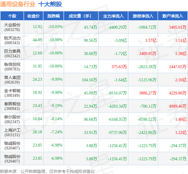 个股表现方面,通用设备行业当日领跌股为大业股份(603278),该股当日报收12.92,下跌10.03%,成交量43.74万,主力资金净流出4400.29万元。航天动力(600343)以下跌10.0%紧随其后,该股当日成交量90.56万,主力资金净流出3.09亿元。除此之外,巨力索具(002342)、鲁信创投(600783)、雪人集团(002639)均进入当日熊股之列。具体个股列表见下表: