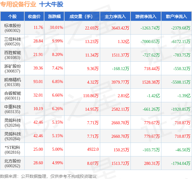 个股表现方面,专用设备行业当日领涨股为标准股份(600302),该股当日报收11.76,上涨10.01%,成交量22.69万,主力资金净流入3643.42万元。三佳科技(600520)以上涨9.99%紧随其后,该股当日成交量13.23万,主力资金净流入1.32亿元。除此之外,百胜智能(301083)、浙矿股份(300837)、凯格精机(301338)均进入当日牛股之列。具体个股列表见下表: